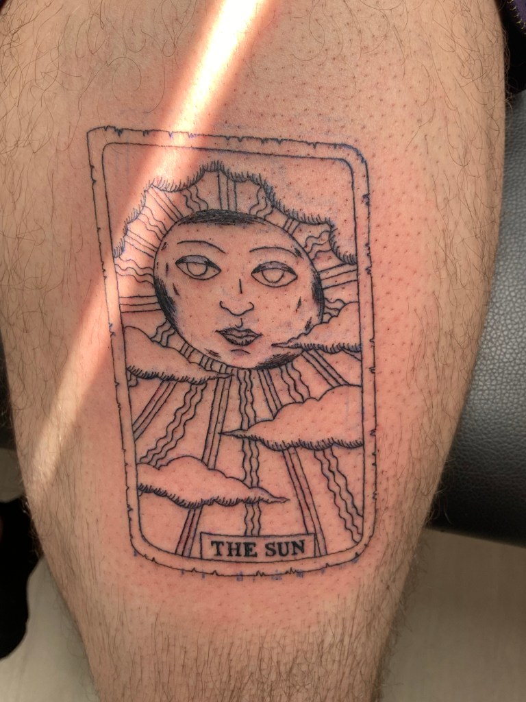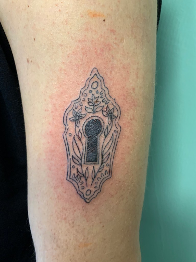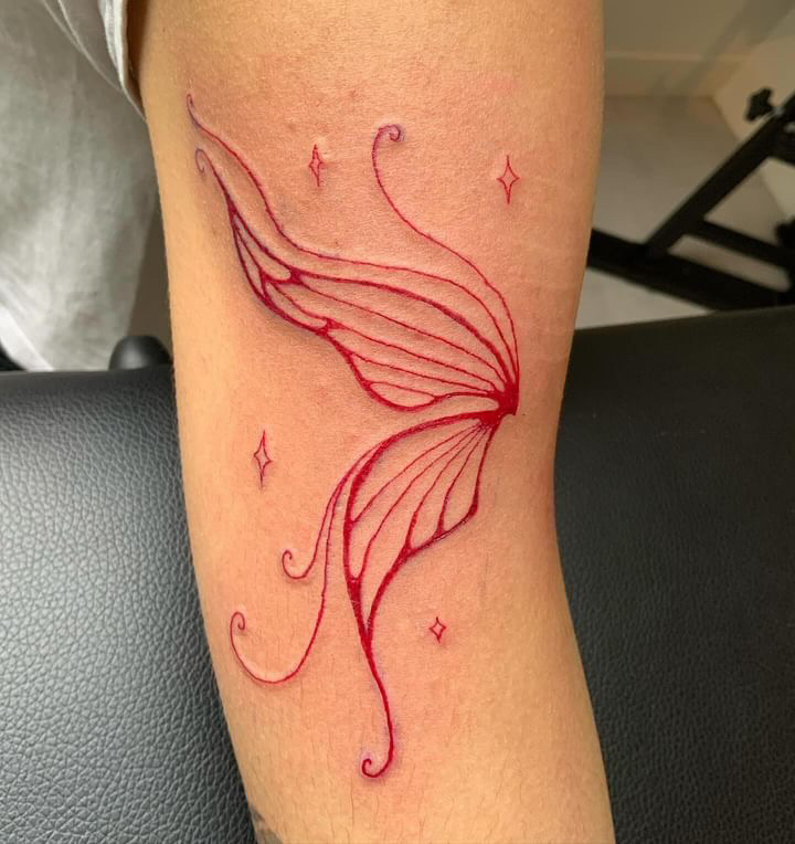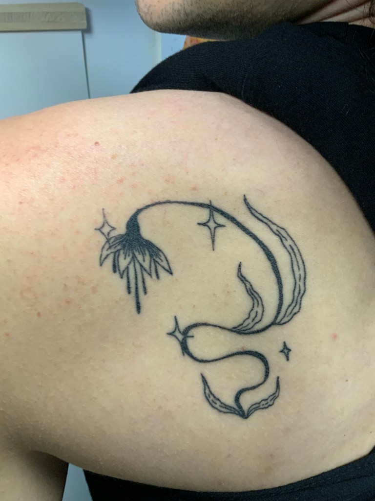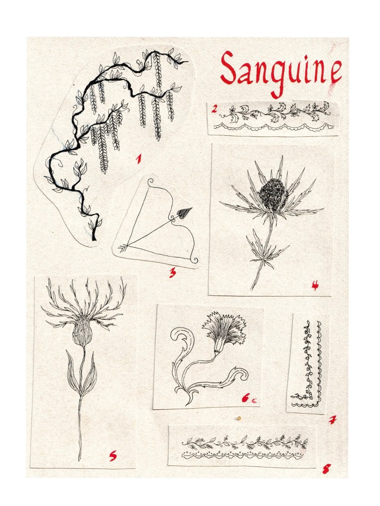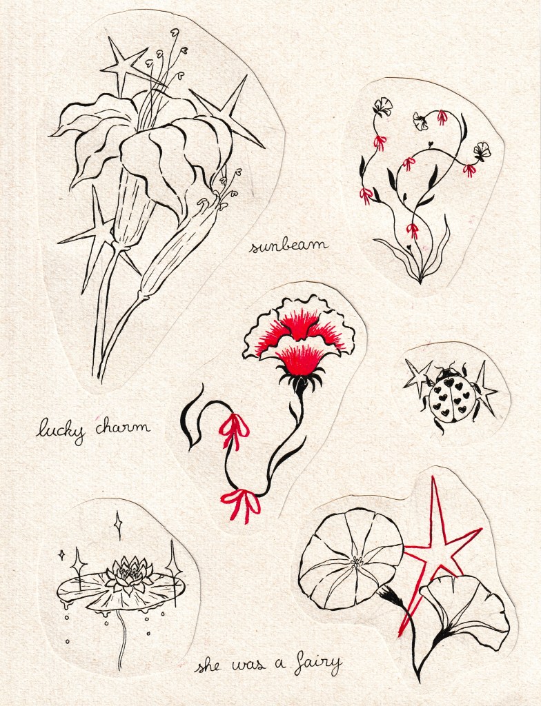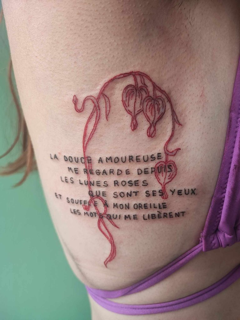 Je propose du tatouage en fine line, presque comme un dessin au crayon, des mots doux ou féministes, des peauèmes, en noir ou en rouge. J’aime surtout proposer des flashs, en fonction de mes inspirations, toujours dans un style fait main, doux et ornemental.